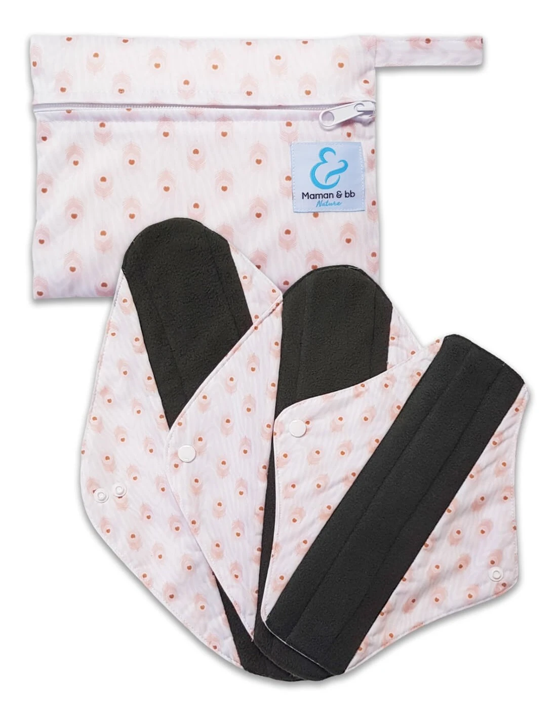Maman et bébé nature vous propose ce kit Essentielles plus composé de 4 serviettes hygiéniques lavables en charbon de bambou et leur pochette de transport imperméable.