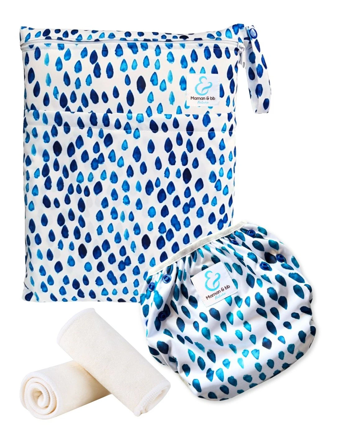 Kit Baignade Bébé – Couche Maillot De Bain Lavable + Sac Imperméable + Inserts – Blue Rain