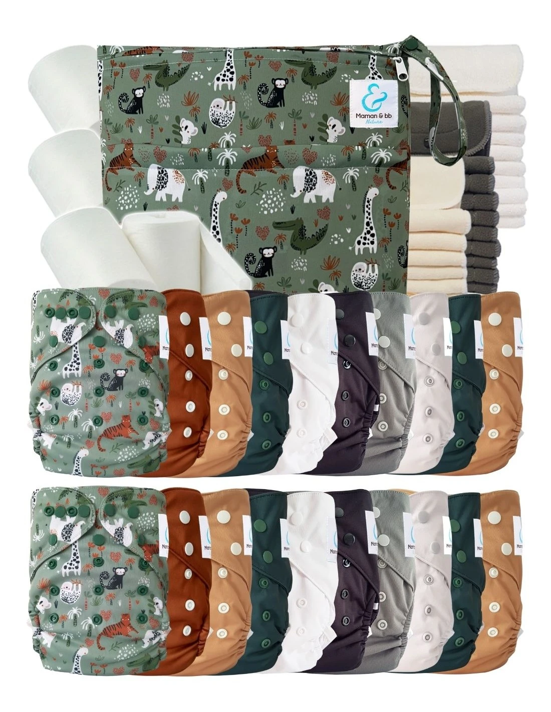 Mega Pack : 20 Couches Lavables TE2 + 30 Inserts + 400 Voiles + Sac – Jungle