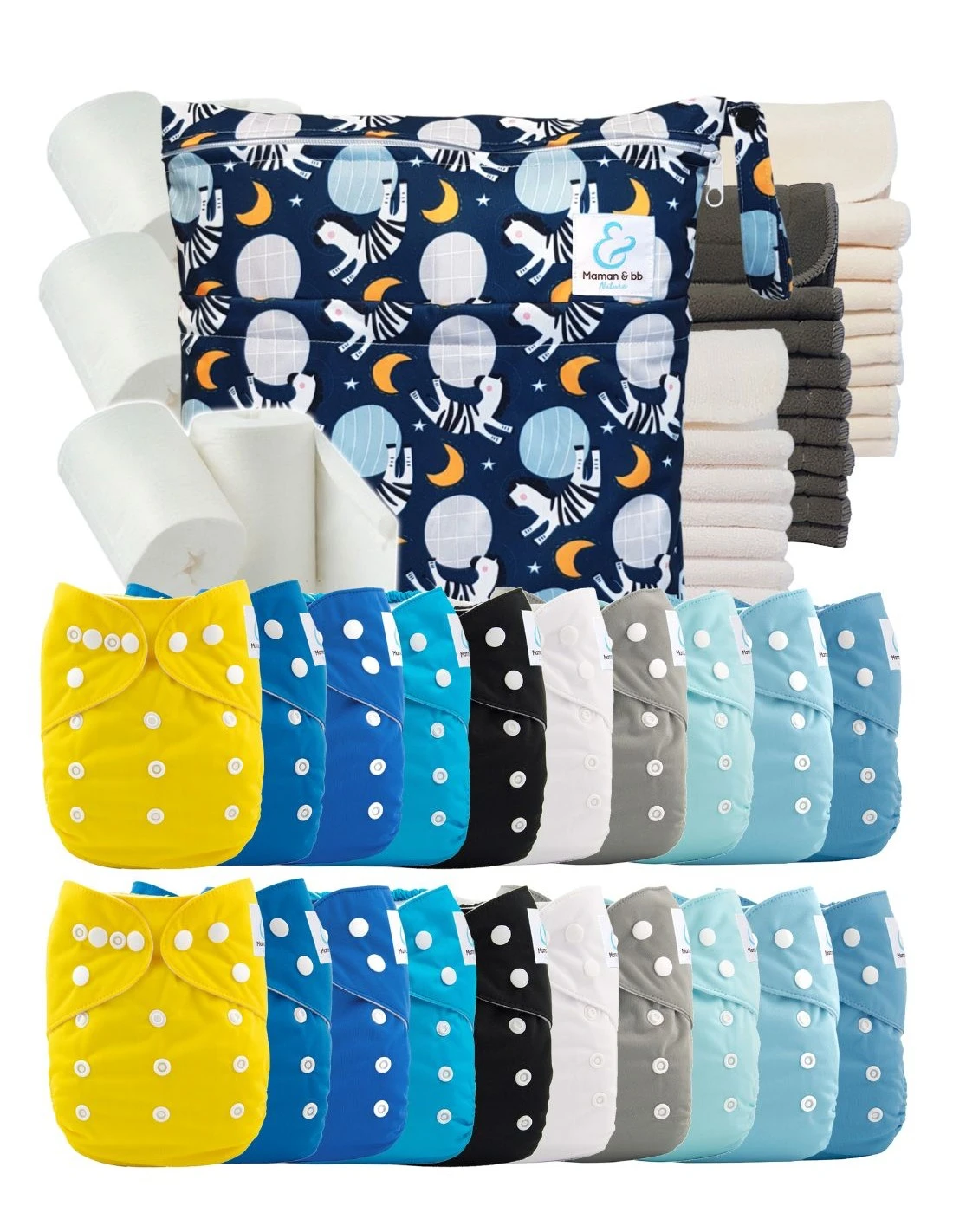 Mega Pack : Lot De 20 Couches Lavables TE1 + 40 Inserts + 400 Voiles + Sac Imperméable – Caleb
