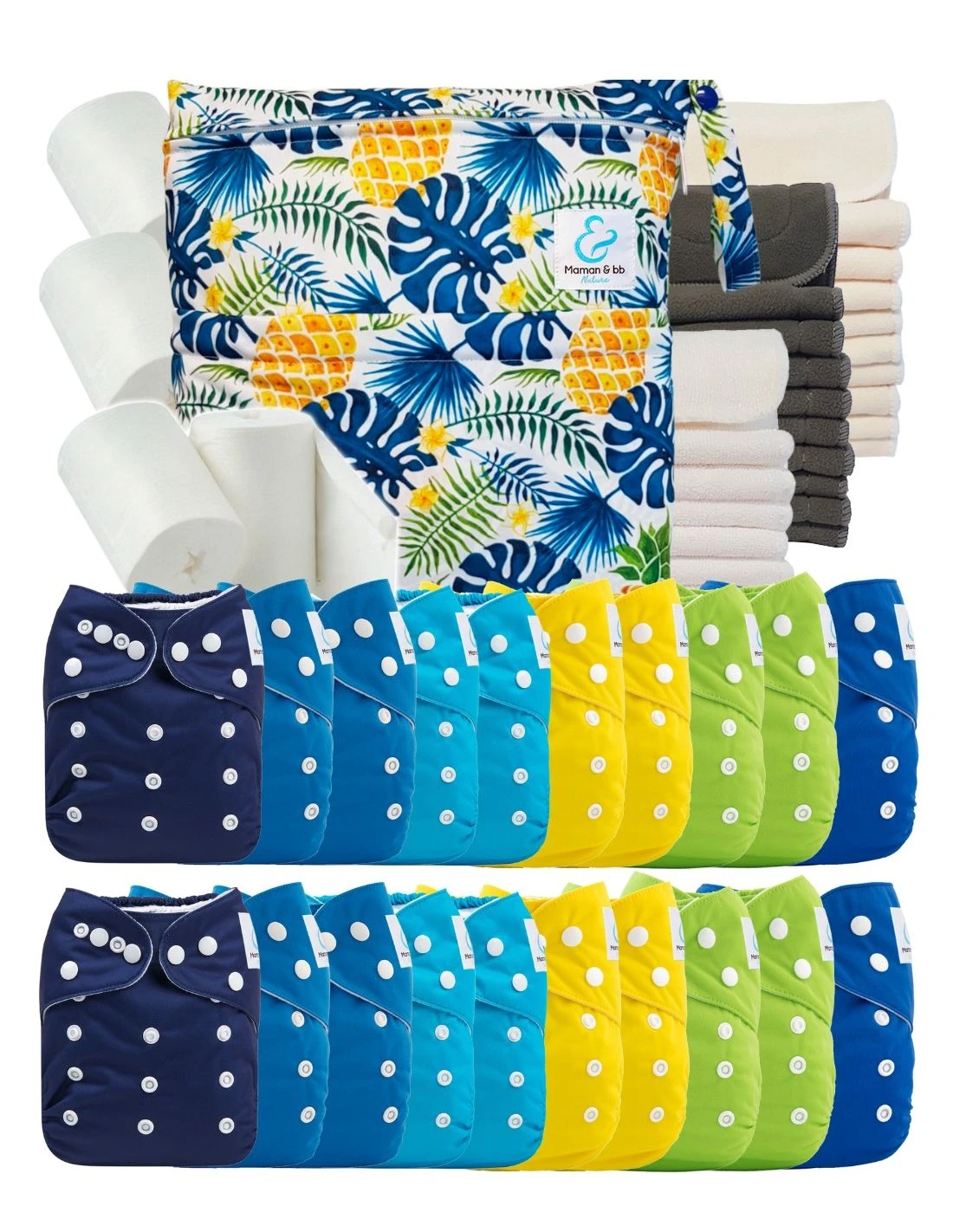 Mega Pack : Lot De 20 Couches Lavables TE1 + 40 Inserts + 400 Voiles + Sac Imperméable – Exotic