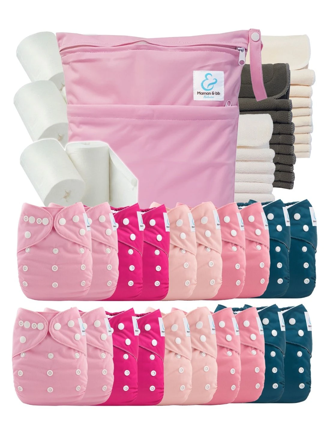 Mega Pack : Lot De 20 Couches Lavables TE1 + 40 Inserts + 400 Voiles + Sac Imperméable – Romance