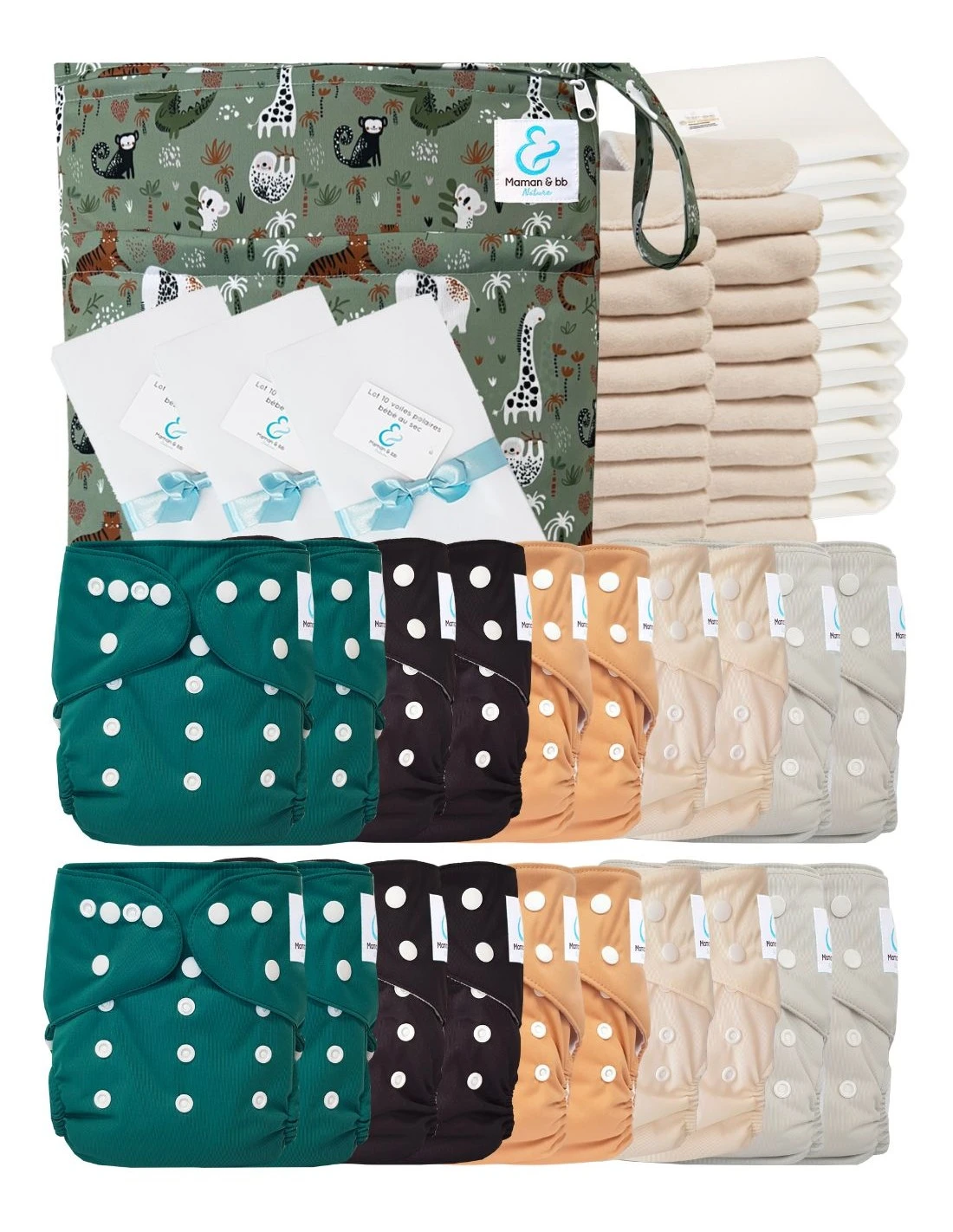 Mega Pack Sensitive : 20 Couches Lavables TE1 + Inserts + Voiles + Sac – Jungle