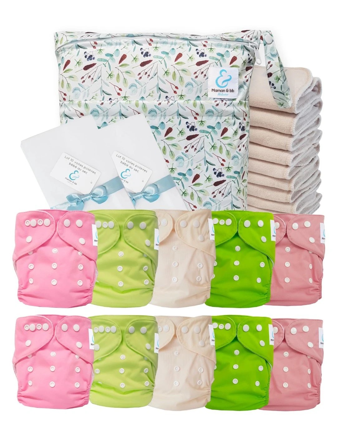 Pack Premium Sensitive : 10 Couches Lavables TE1 + Inserts En Coton + Voiles + Sac – Nature