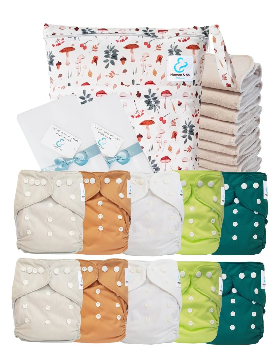 Pack Premium Sensitive : Lot De 10 Couches Lavables TE1 + Inserts Coton + Voiles + Sac – Automne