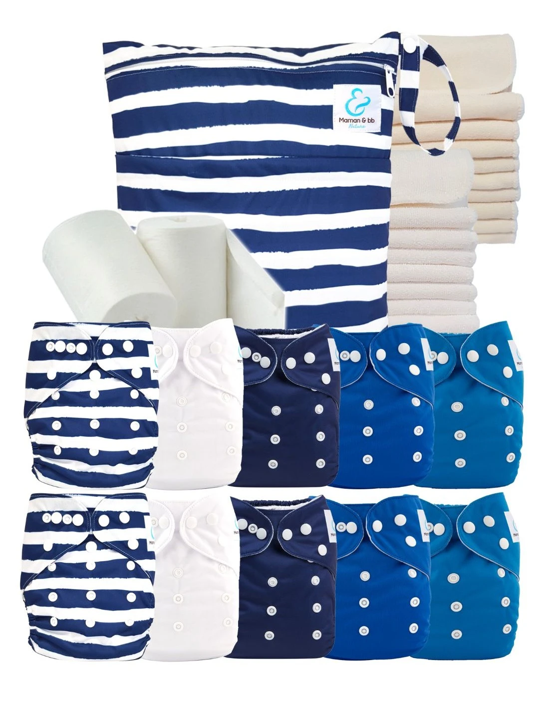 Pack Premium TE1 : Lot 10 Couches Lavables + Inserts + Voiles + Sac – Marinière